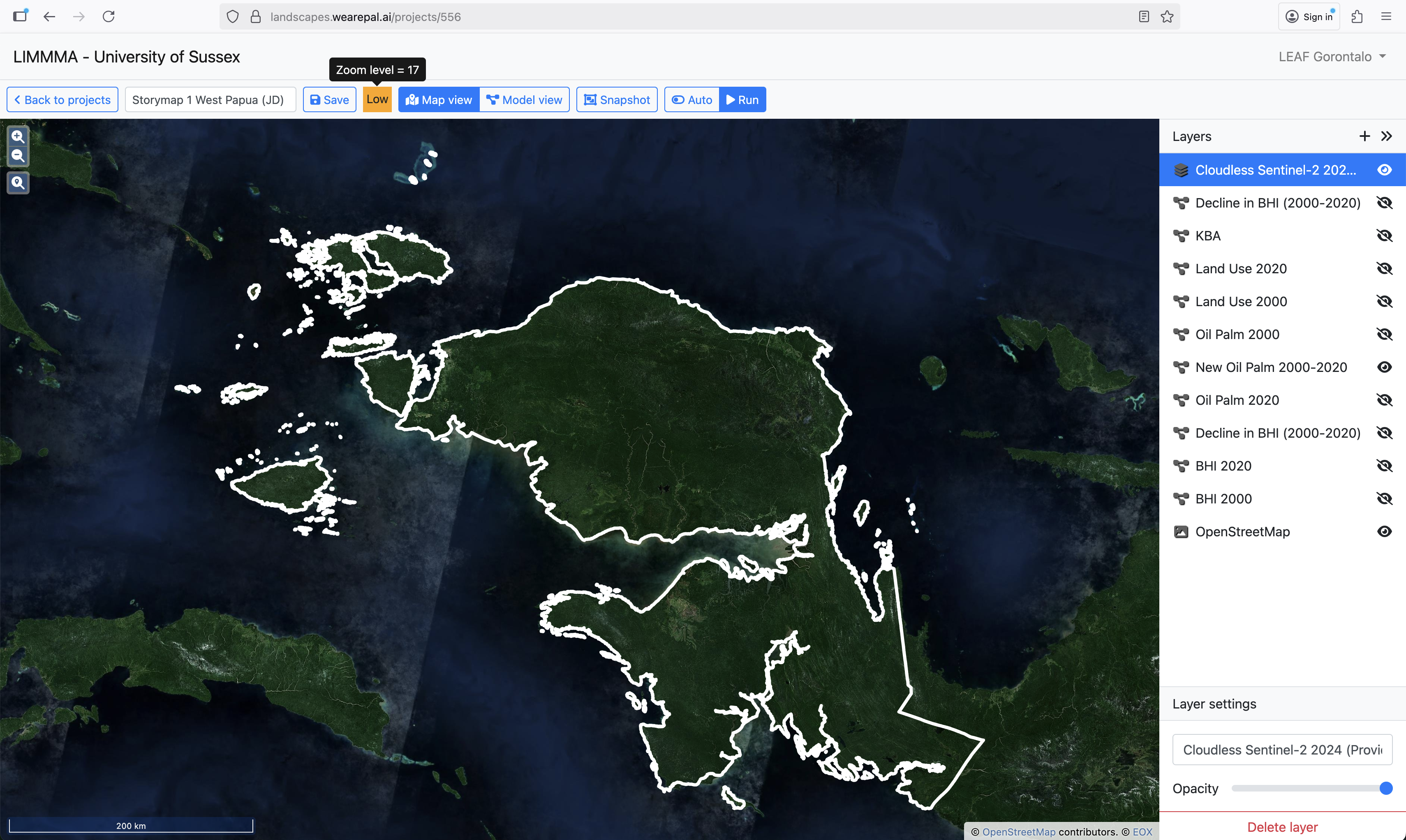 The scale of changes seen more clearly in close up using the slider to reveal the changes between 2000 and 2020. The following sliders show different parts of West Papua in close up.